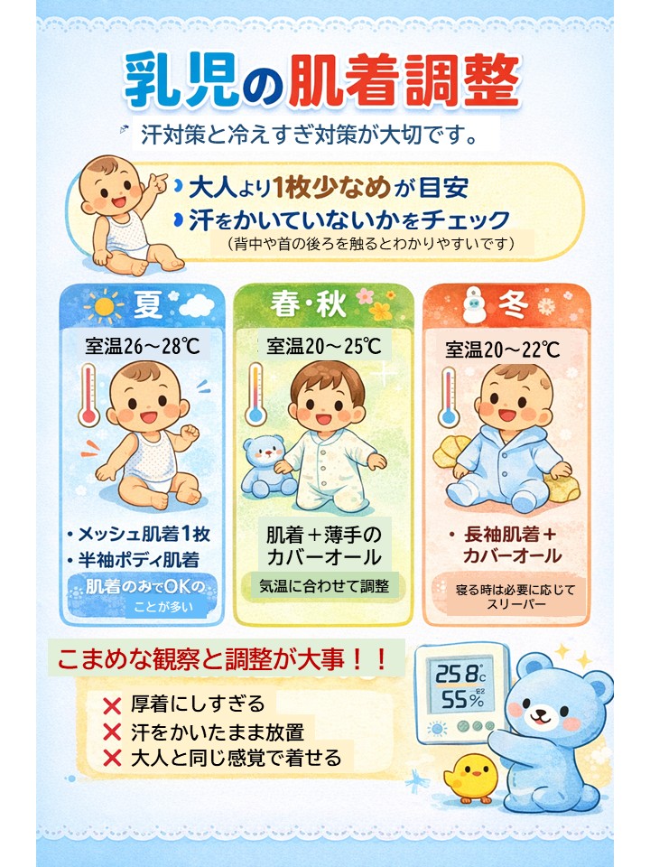 小児の肌着調整は、「暑すぎず・冷えすぎず」をこまめに調整することがポイントです。大人より体温調節が未熟なので、服の選び方と着せ方がとても重要です。