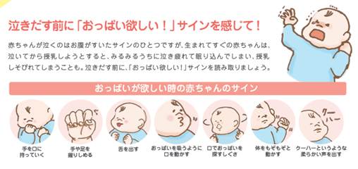 ・子どもが欲しがるサインや、授乳時の抱き方、乳頭(哺乳瓶の乳首)の含ませ方等について伝え、適切に授乳できるよう支援する。