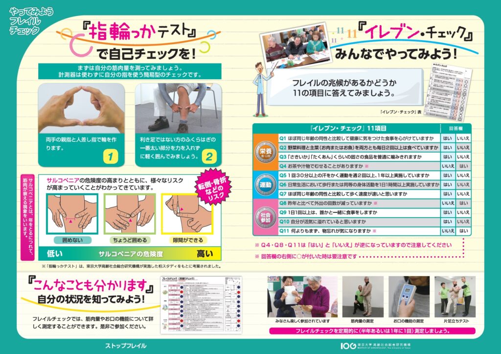 まず、食生活で、「三食欠かさず、定時に同じカロリー、栄養を食べる」「大豆などの植物性たんぱく質に加えて、肉や卵などの動物性たんぱく質を適量摂る」「カルシウムやビタミンなども積極的に」が重要です。最近の研究で、高齢者の消化吸収機能は保持されていて、タンパク質を積極的にとっても、腎機能が悪い方以外は、十分消化吸収され、筋肉量の維持につながるそうです。