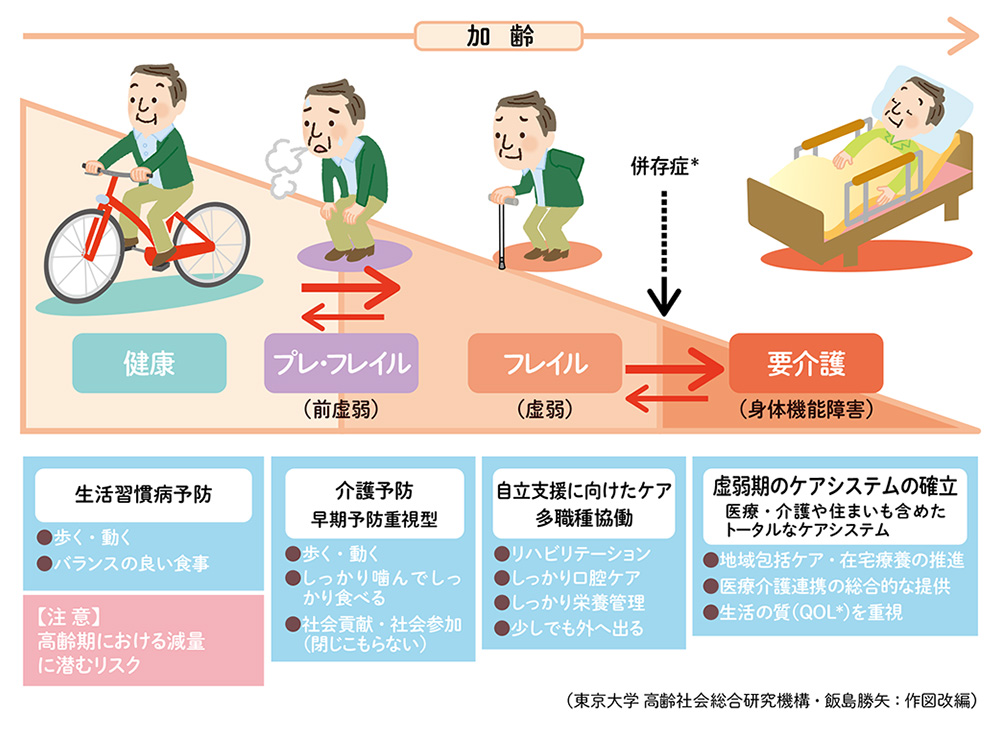 日本人の「平均寿命」は常に男女ともに世界1、2位を争っているのは周知の事実です(2021年統計にて男性81.7歳で第2位、女性87.2歳で第1位)。しかし、医療者は、平均寿命から寝たきりや認知症など要介護状態の期間を差し引いた「健康寿命」を重視しており、実は愛知県は男性全国15位(72.91歳)、女性6位(76.07歳)です(2022年)。これは、介護に対して前向きな県の取り組みがあっての上での誇るべき順位なのです。要介護になる条件は、生活習慣病の悪化が考えられますが、実は認知症や老衰、転倒骨折などの方が多いと言われています。そこで、今大きく注目されているのは「フレイル」という新しい概念です。