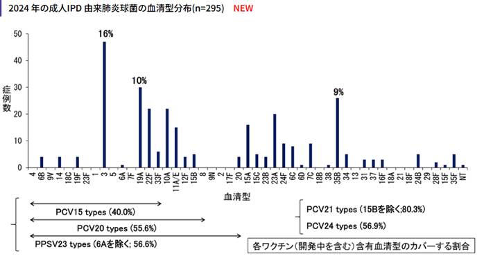 さらに、最近の高齢者の肺炎球菌性肺炎の原因菌の血清カバー率が、PCV15、PCV20、PPSV23が28.0%、43.7%、44.1%であったのに対して、PCV21は71.9&と非常に高かった。