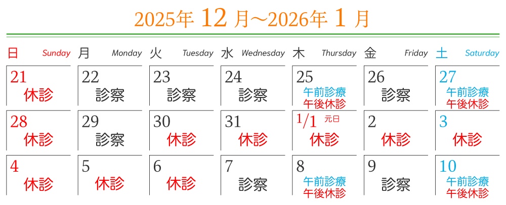 2025年12月30日(火)から2026年1月6日(火)まで年末年始の休診とさせていただきます。
